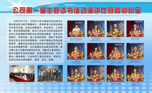 2013年10月23日下午,公司年度主題讀書(shū)活動(dòng)演講比賽在基地多功能廳隆重舉行。賈盼盼等12位同志圍繞今年讀書(shū)主題,分別從把握細節、向往快樂(lè )、心懷感恩、講求孝道等視角,結合工作及自己的生活經(jīng)歷抒發(fā)對工作的滿(mǎn)腔熱情和對生活的美好愿望。選手們純真質(zhì)樸、熱情洋溢、感人至深的演講,得到了領(lǐng)導和同志們充分肯定和熱情贊揚,大家不斷報以熱烈的鼓勵掌聲。董事長(cháng)張紅星在總結講話(huà)中深刻闡述了讀書(shū)對生活的重要作用;文化發(fā)展對企業(yè)成長(cháng)的作用;表示要為員工發(fā)展創(chuàng )造更好的平臺,激勵員工奮發(fā)努力;要求主題讀書(shū)活動(dòng)長(cháng)期抓,演講比賽年年搞,力爭一屆比一屆辦得好,讓全體員工通過(guò)多讀書(shū)、讀好書(shū),在讀書(shū)活動(dòng)中得到提升、提高、成長(cháng)、發(fā)展。